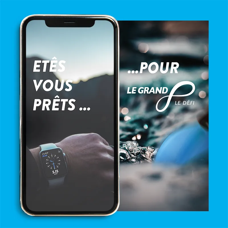 Un nom, “Le Grand Défi”, et un logo sont créés spécifiquement pour la course. Le design du logo fait un clin d’œil au parcours en forme de 8, une coïncidence parfaite avec le nom de l’association ! Il en résulte un logo dynamique, inspirant le mouvement, la fraîcheur et la fluidité des paddles sur l’eau.